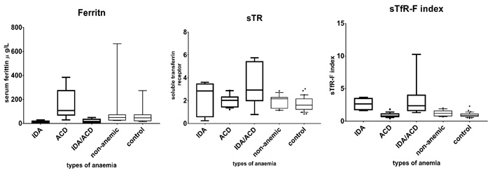 anaemia was present in 34/50 patients; 19 patients had ACD, 9 had ACD/IDA and only 6 patients had IDA. Both the sTfR and the sTfR-F index showed a significant difference between anaemia groups (P values = 0.037 and 0.001, respectively). sTfR-F index has shown to be a very useful parameter that can discriminate efficiently between IDA and ACD and between ACD and ACD/IDA in patients with RA.
